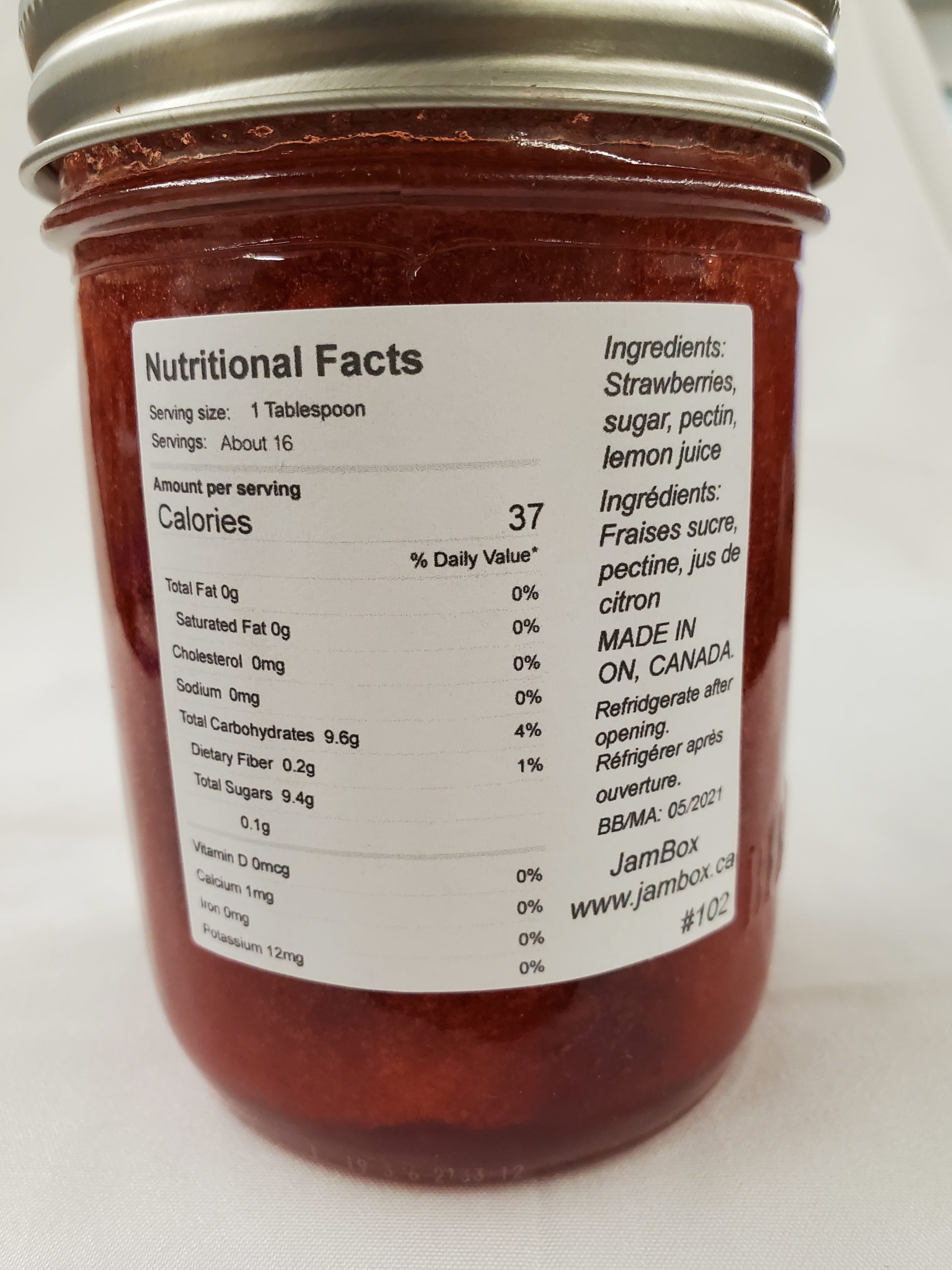 JamBox strawberry jam 250ml. We use the freshest fruit we can find and each order is carefully homemade and delivered to your door. We use a recipe that embraces real fresh fruit with no artificial colors or flavors. Gluten-free, eco-friendly. The shelf life is approx 10 months unopened and approx 90 days refrigerated once opened.